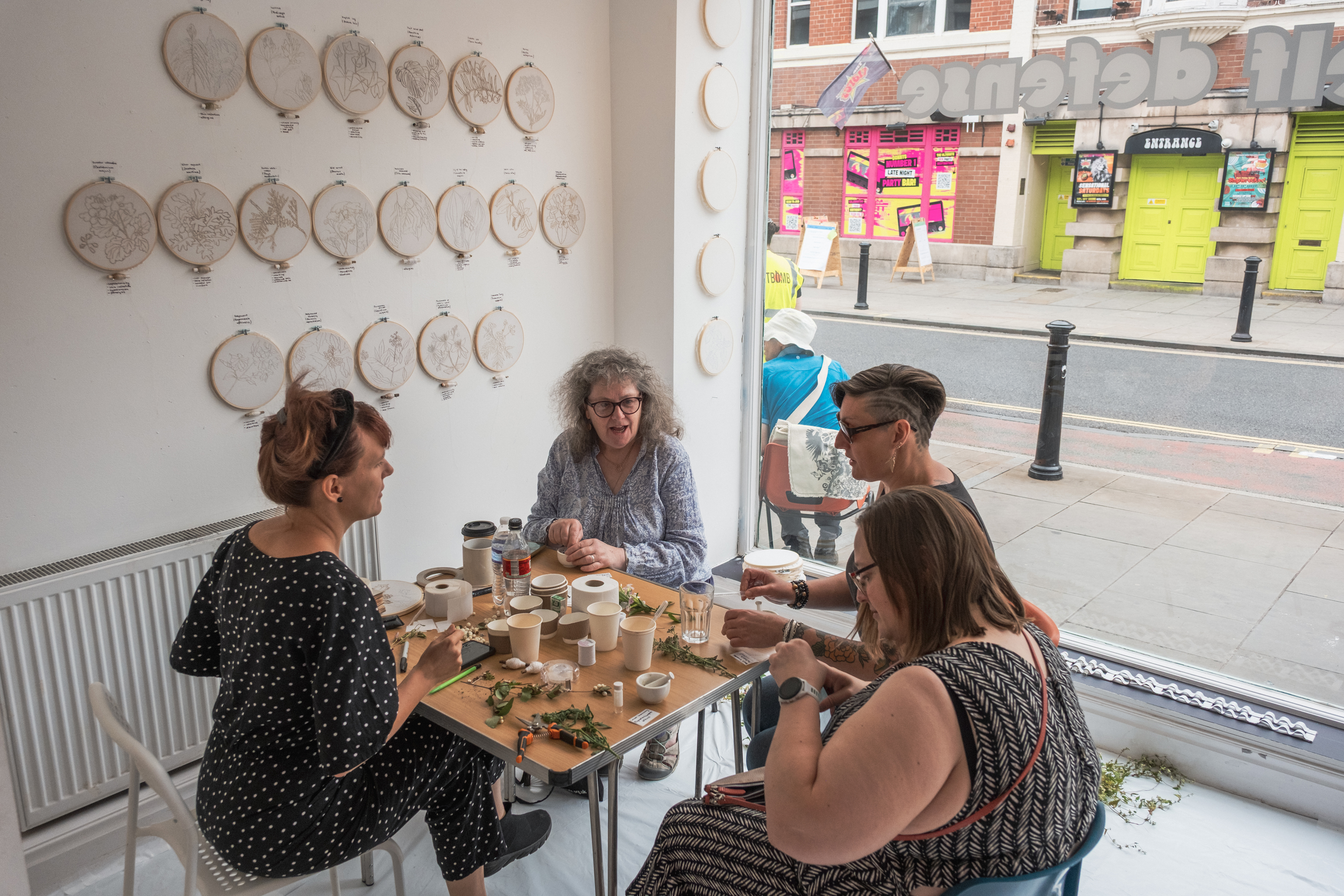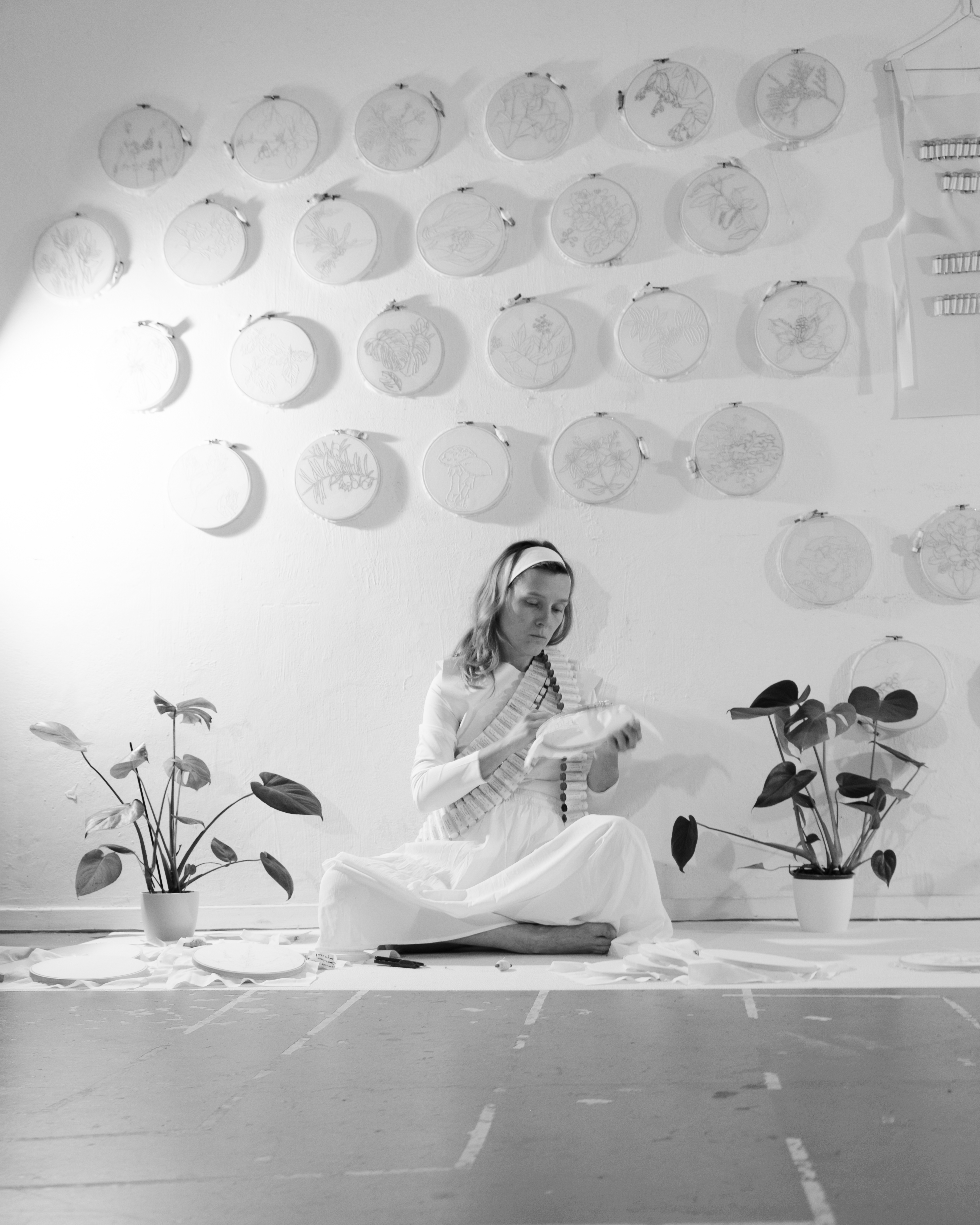 A crucial element of the project is the search for simple, accessible forms of resistance, such as craft and being together. The poisonous saps of the plants I collect are used to soak white thread. A plant is then embroidered with thread soaked in its own toxic “blood.” I travel with the project, engaging local communities in working with plants and doing craft together. Embroidery becomes a symbolic act of resistance, representing regular, safe, everyday life. I heard stories of women stitching, embroidering, or knitting in bomb shelters. Embroidery requires manual activity, time, and patience—everything we often lack today. Doing embroidery together helps people calm down and talk.